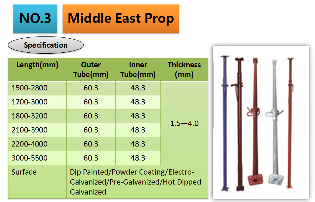 Middle east prop(also named heavy duty prop) is the most popular one,many regions use this type,such as middle east, soth American, Southeast Asia and so on. Adjustable length1500-2800/1700-3000/1800-3200/2100-3900/2200-4000/3000-
